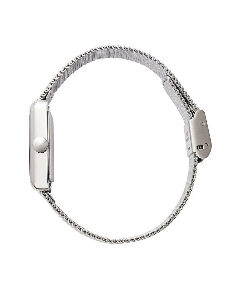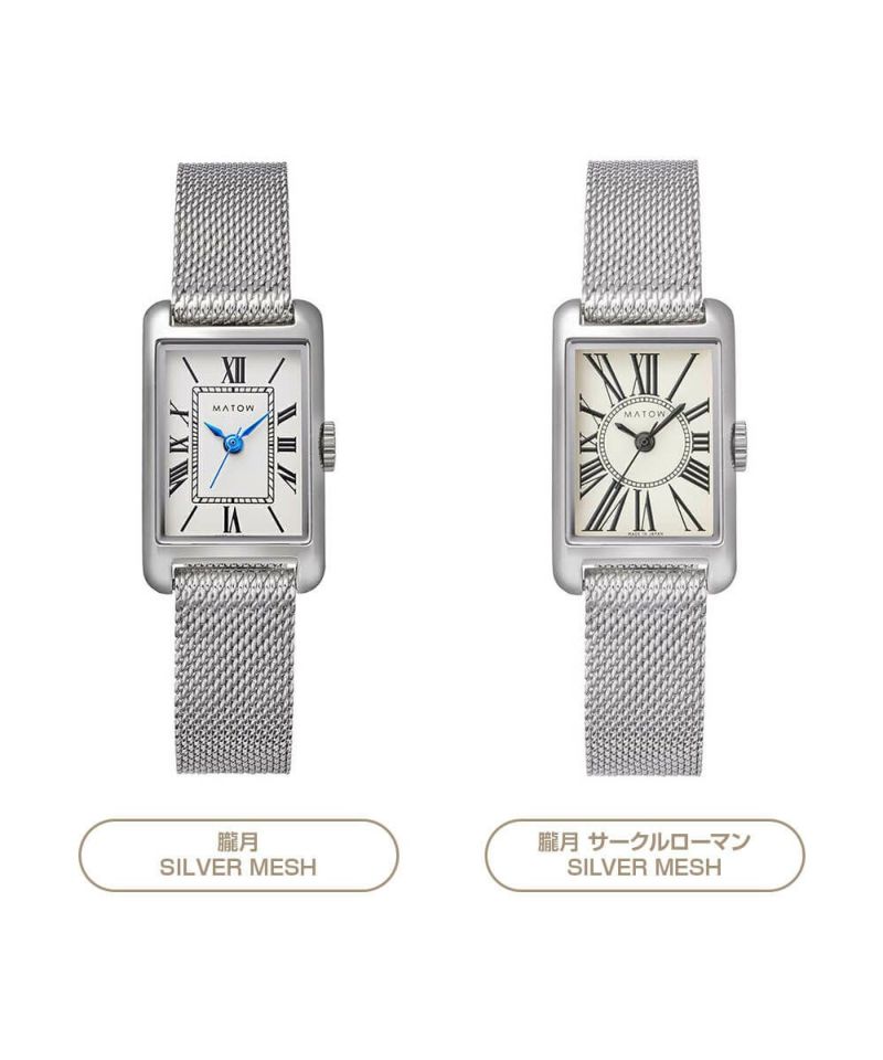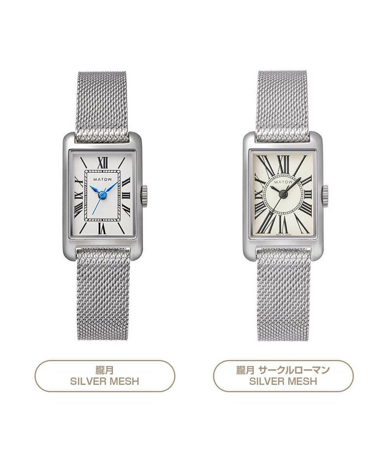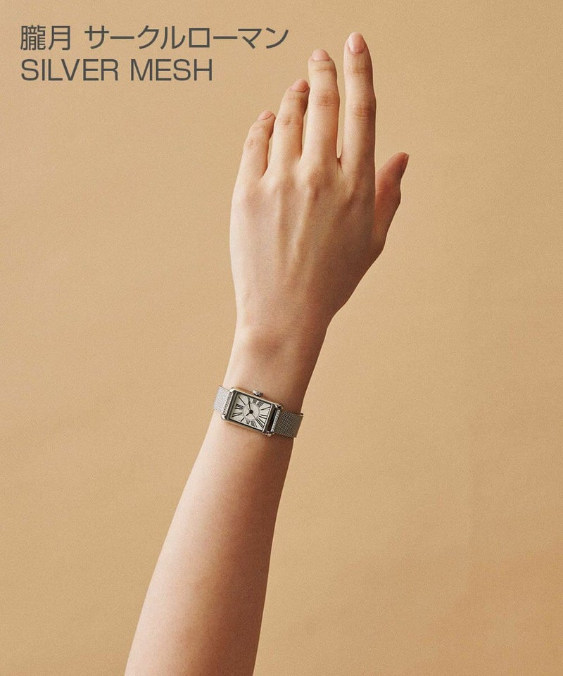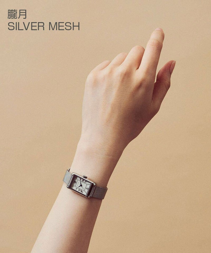 縦29mm×横18mmのコンパクトなレクタングルケースは、ローズゴールドとシルバーの2色展開。型押しのレザーベルトとケース同色のメッシュベルトから、あなただけのスタイルを選べます。
