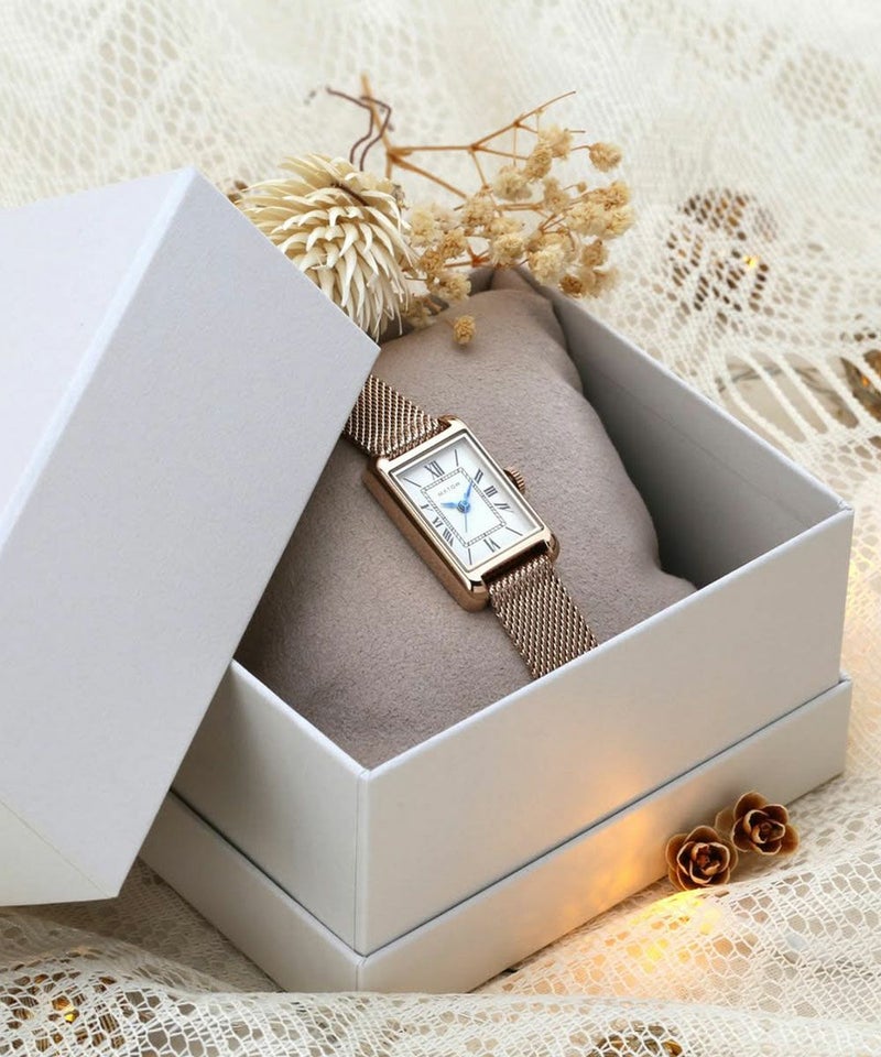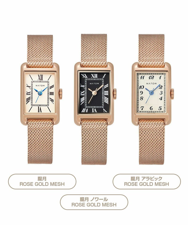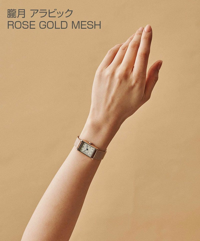 縦29mm×横18mmのコンパクトなレクタングルケースは、ローズゴールドとシルバーの2色展開。型押しのレザーベルトとケース同色のメッシュベルトから、あなただけのスタイルを選べます。