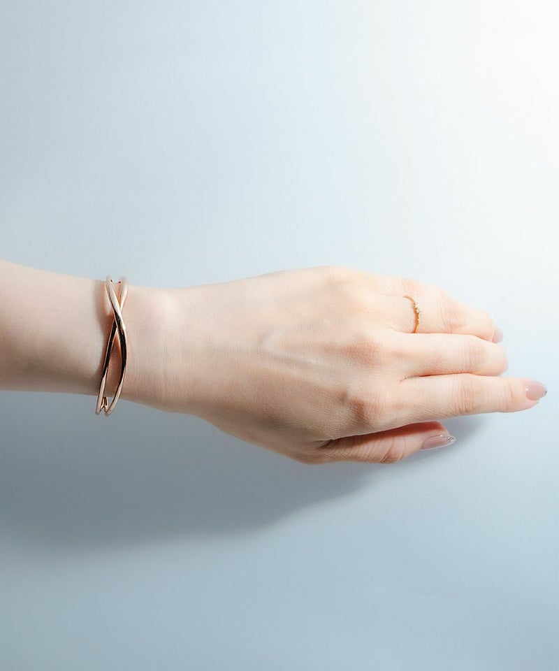 流れるような曲線を描く「CROSS BANGLE(クロスバングル)」。女性が持つしなやかな美しさ、変化する気持ちのうつろいやあいまいさを、流れるような曲線とみずみずしいテクスチャで表現している。もちろん、このままアクセサリーバングルとしても着用可能ではあるが、このアイテムにはもうひとつの着用方法が。別売のウォッチケース時計本体と組み合わせることで、バングルタイプのウォッチベルトとしても使用することが出来る。バングルの両先端がフックのように湾曲しており、時計本体のベルトを引き通すためのラグに引っ掛けると、今まで見たことの無いような洗練されたデザインのバングルウォッチが完成する。バングルの両サイド部分を押し込むだけでフックが緩み、簡単に着脱をすることも可能。耐久性や強度、磨き上げた時の輝きにも拘り、素材はシルバー925を採用した。