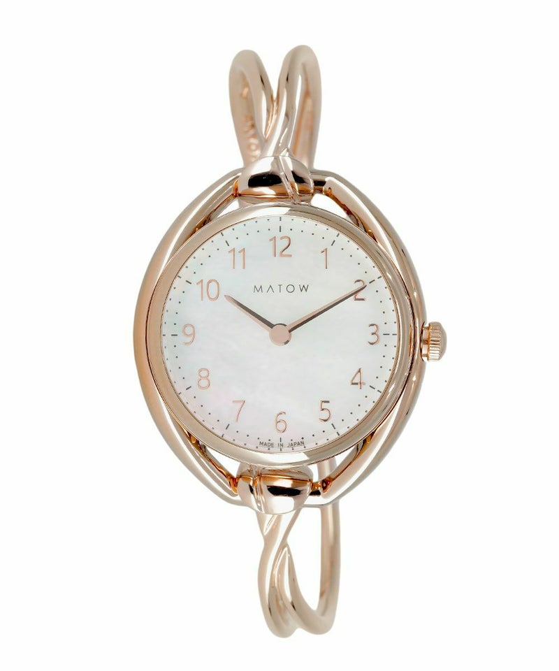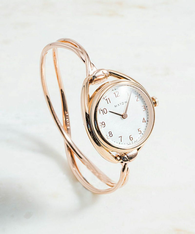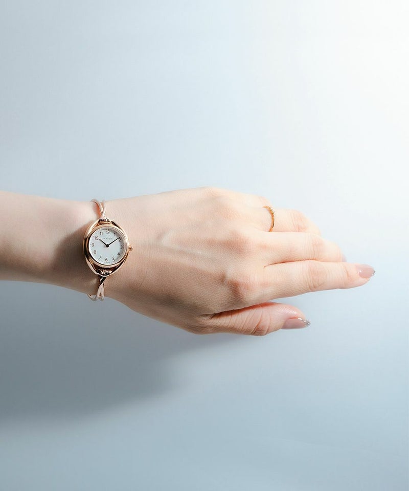 流れるような曲線を描く「CROSS BANGLE(クロスバングル)」。女性が持つしなやかな美しさ、変化する気持ちのうつろいやあいまいさを、流れるような曲線とみずみずしいテクスチャで表現。バングルの両先端がフックのように湾曲しており、時計本体のベルトを引き通すためのラグに引っ掛けると、今まで見たことの無いような洗練されたデザインのバングルウォッチが完成。バングルの両サイド部分を押し込むだけでフックが緩み、簡単に着脱をすることも可能。耐久性や強度、磨き上げた時の輝きにも拘り、素材はシルバー925を採用しました