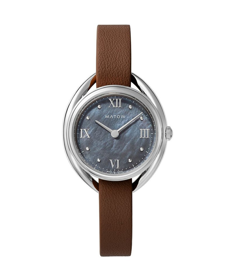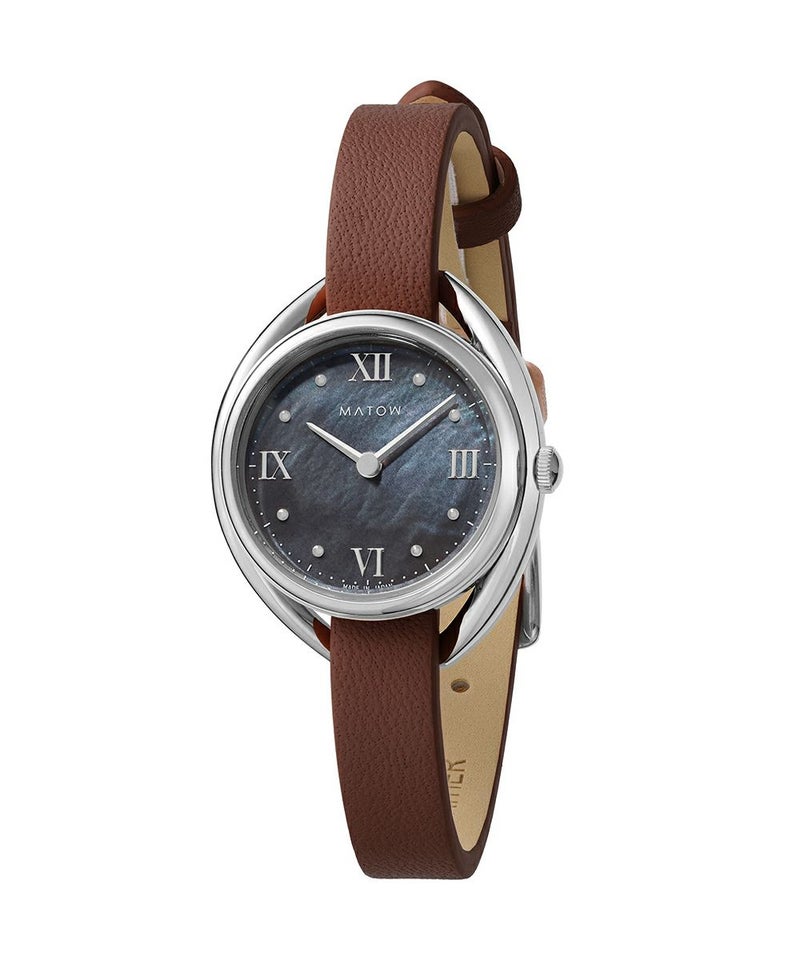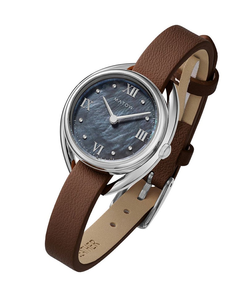 藍炭は、深みのある藍色と炭のような黒が絶妙に混ざり合った、落ち着きと神秘さを併せ持つ色彩。ブラックマザーオブパールの文字盤が、光の角度によって繊細に輝き、藍炭の色合いにさらなる奥行きを与えます。この独特な色彩と質感のコントラストが、見るたびに異なる表情を見せ、穏やかな湖面のような静けさと、夜空に浮かぶ星のような神秘的な美しさを手首に纏う感覚を演出します。上品でありながら大胆なデザインは、日常のどんなシーンにもふさわしく、特別なひと時にも華を添えることでしょう。