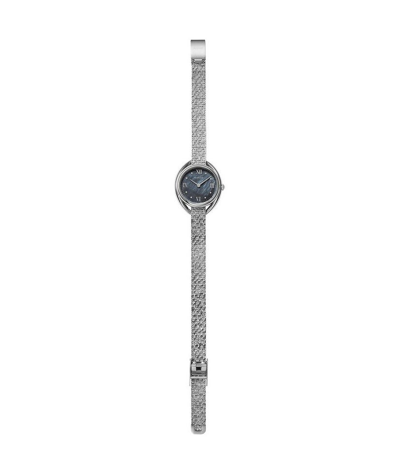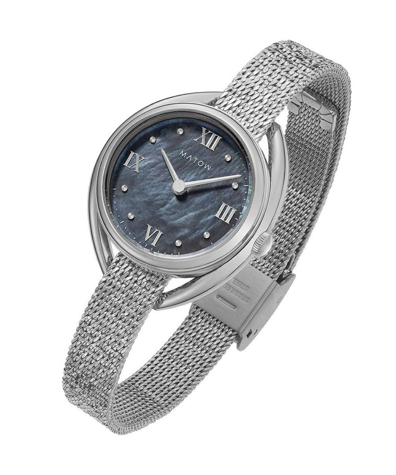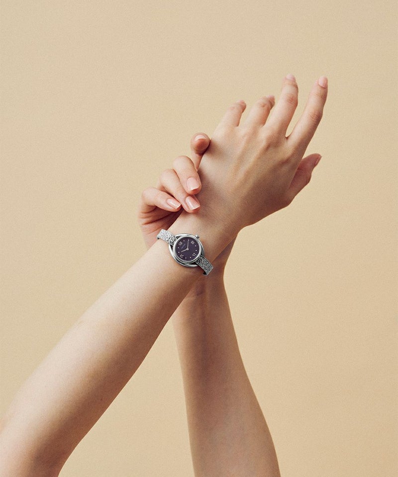 藍炭は、深みのある藍色と炭のような黒が絶妙に混ざり合った、落ち着きと神秘さを併せ持つ色彩。ブラックマザーオブパールの文字盤が、光の角度によって繊細に輝き、藍炭の色合いにさらなる奥行きを与えます。この独特な色彩と質感のコントラストが、見るたびに異なる表情を見せ、穏やかな湖面のような静けさと、夜空に浮かぶ星のような神秘的な美しさを手首に纏う感覚を演出します。上品でありながら大胆なデザインは、日常のどんなシーンにもふさわしく、特別なひと時にも華を添えることでしょう。