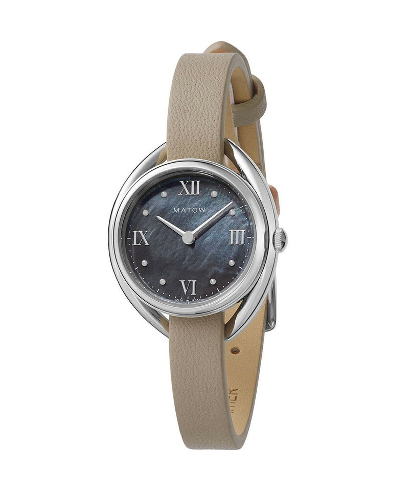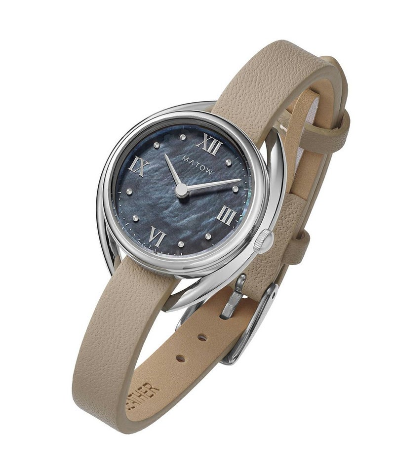 藍炭は、深みのある藍色と炭のような黒が絶妙に混ざり合った、落ち着きと神秘さを併せ持つ色彩。ブラックマザーオブパールの文字盤が、光の角度によって繊細に輝き、藍炭の色合いにさらなる奥行きを与えます。この独特な色彩と質感のコントラストが、見るたびに異なる表情を見せ、穏やかな湖面のような静けさと、夜空に浮かぶ星のような神秘的な美しさを手首に纏う感覚を演出します。上品でありながら大胆なデザインは、日常のどんなシーンにもふさわしく、特別なひと時にも華を添えることでしょう。