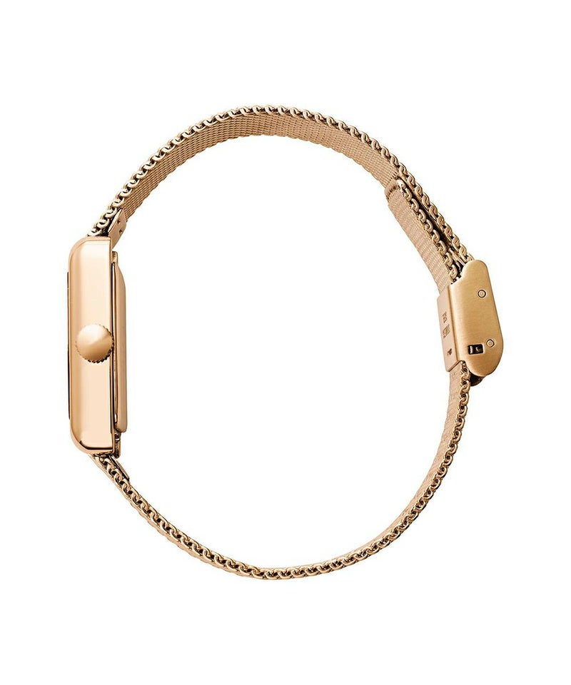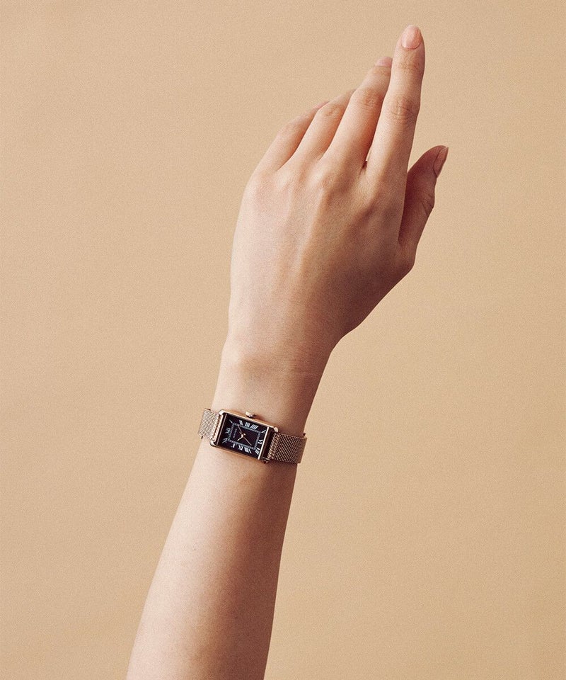 縦29mm×横18mmのコンパクトなレクタングルケースは、ローズゴールドとシルバーの2色展開。型押しのレザーベルトとケース同色のメッシュベルトから、あなただけのスタイルを選べます。