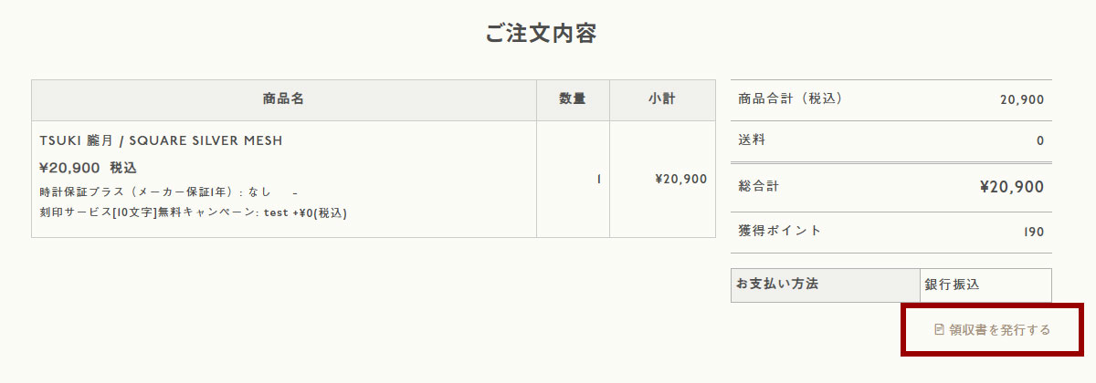 商品お届けののち当店にてご注文完了処理後に、[マイページ>注文履歴>ご注文履歴詳細]に、「領収書を発行する」ボタンが表示されますので、そちらからダウンロードください。
